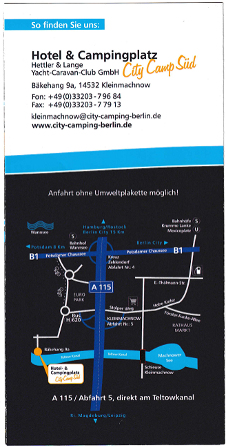 In etwa 7 km Entfernung von der SV03, auf historischem Gelände direkt am Teltowkanal, liegt der Campingplatz „City Camp Süd“.